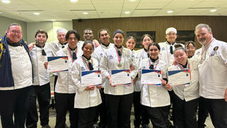 Monroe University's competition team recently had a huge undertaking with a trip to Kansas for the American Culinary Federation Qualifier. For the first time ever, regardless of region, the top four scores for each competition move forward. In previous years, it was by region. A total of 15 people traveled, as the Core Five brought with them their Support 5 team that has been with them every step of the way in their journey. Two Student Chef of the Year contenders in seniors Thomas Bradburn and Jeovanny Adames, who both competed and won last year's National Student Team Competition with their team, came back for more. Both Dean Costantino and assistant coach Eric Pellazzari, as well as team helper and Thomas's apprentice, Frank Costantino Jr., also accompanied the team.